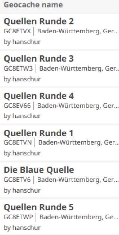 wie haben noch weitere Caches gelegt wie zum Beispiel die Quellenrunde im Altdorfer Wald. Anbei ein Auszug von Geocaching.com